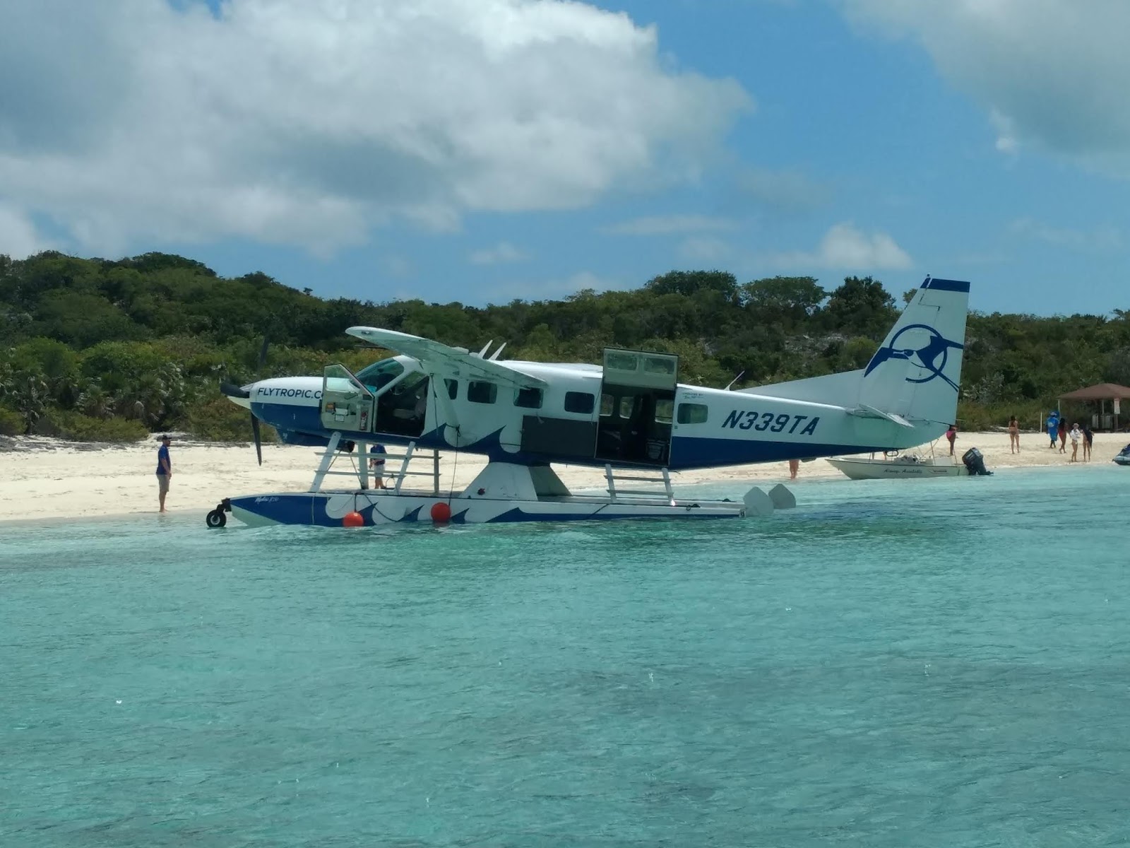 The Pig Beach is a super popular tourist attraction now! This very large float plane landed near the beach. It probably came from Nassau or Georgetown. After the tourists visited and fed the pigs, a boat came to the beach to pick them up and take around the area.